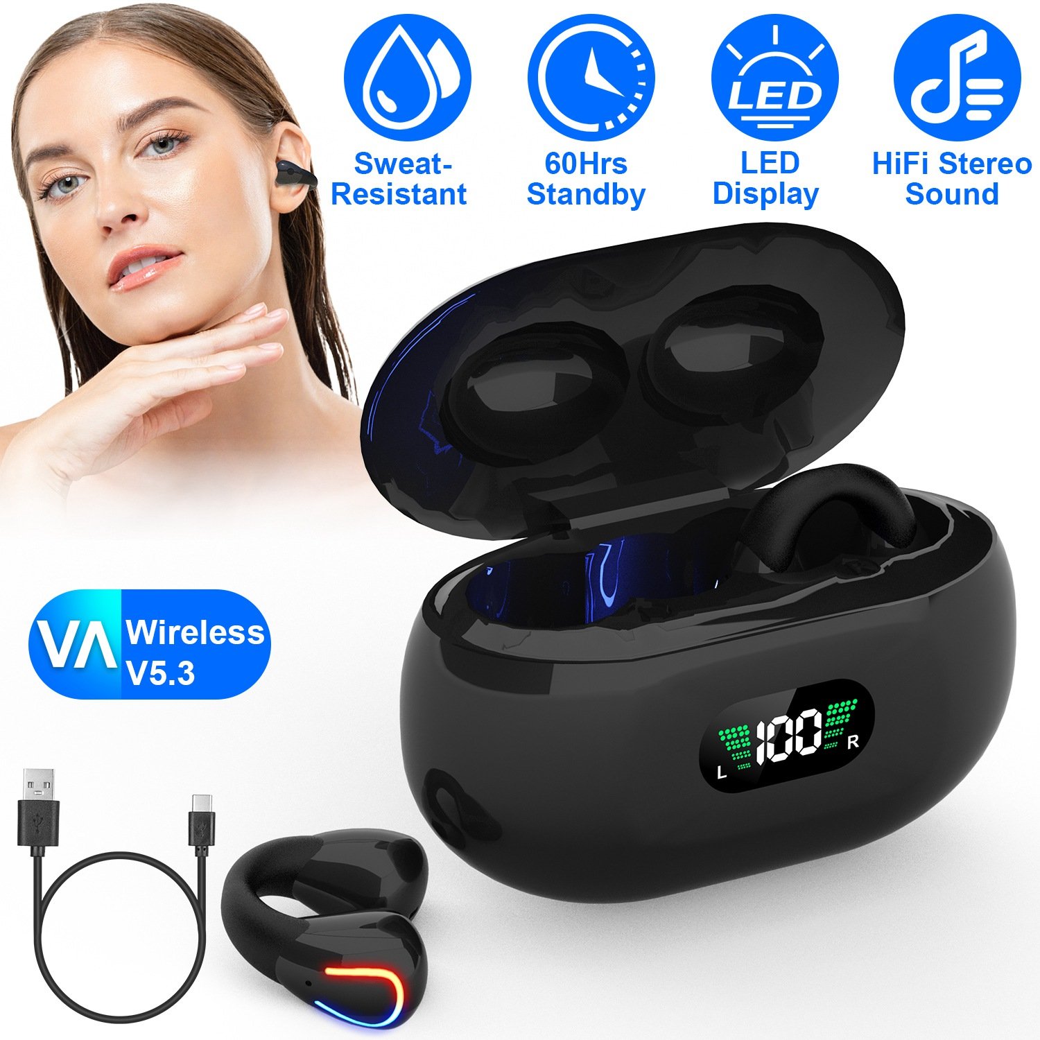 Wireless V5.3 Earbuds Clip-On Open TWS Earphones With Built-In Mic LED Display Charging Case 60H Standby Time IPX3 Waterproof Sweat Resistant Sport Fi