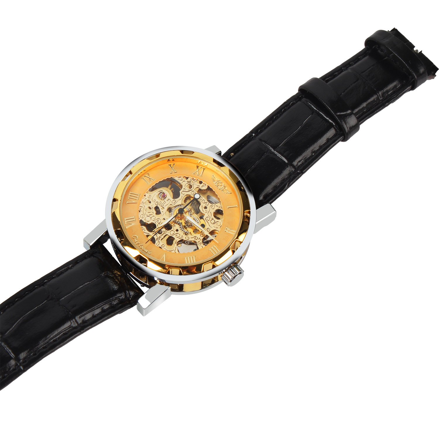 Sleek, stylish, this watch has it all. This Gold Dial Skeleton Mechanical Watch is a fashion forward watch that allows you to see the inner workings of the watch thanks to its transparent dial. Surrounded by a stainless steel watch case, the watch is durable and water resistant. Featuring a high quality real leather band, the watch is the definition of sophistication. Pick no bones about it, the Gold Dial Skeleton Mechanical Watch is the watch for you.